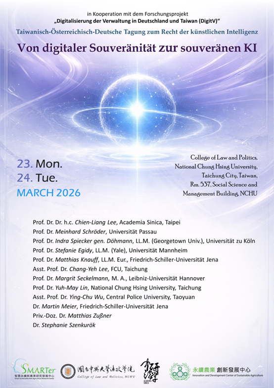 為因應全球數位科技快速發展與地緣政治變化所帶來之法制挑戰,國立中興大學法政學院與中央研究院法律學研究所合作,於2026年3月23日、24日舉辦臺奧德《從數位主權到主權AI》國際研討會,邀集8位來自德國與奧地利之法律學者及多位台灣法律學者,針對歐盟人工智慧法(EU AI Act)、數位主權(Digital Sovereignty)、主權AI(Sovereign AI)、網路安全及關鍵基礎設施保護等核心議題,進行跨國法學對話與深入研討。
