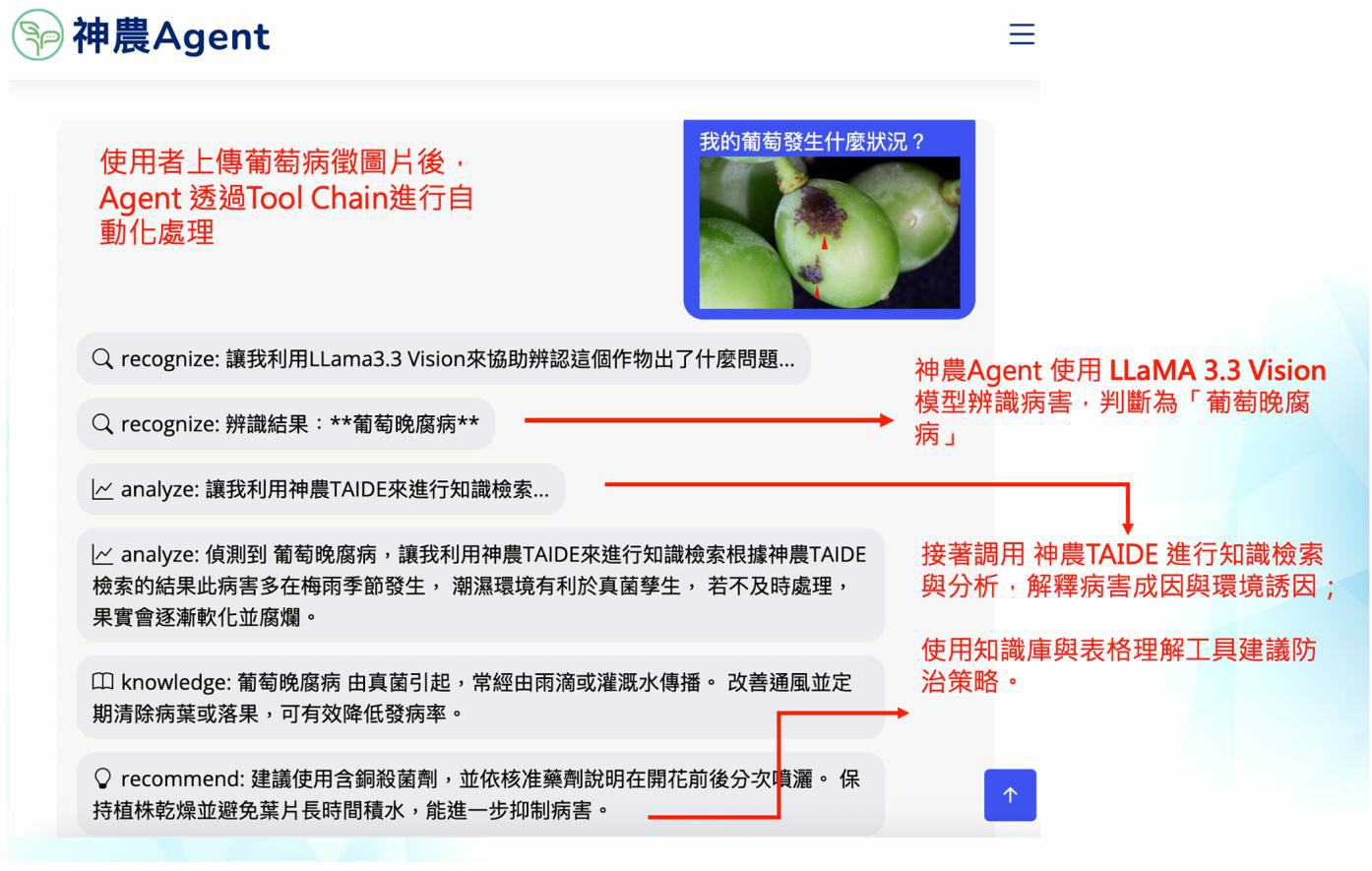 神農Agent 結合農業專業知識與各子計畫所開發的工具,包含植物病理專家、水稻專家所建構的技術模組,形成一跨領域協作智慧化平台。核心特色在透過 Agent 並基於 MCP (Model Context Protocol)架構整合多種前期開發工具並執行複雜任務,成為一個植物診斷 Agent。